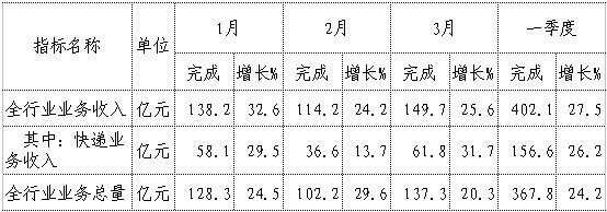 一季度,全行業業務收入完成402.1億元(不包括郵政儲蓄銀行直接營業收入),同比增長27.5%;業務總量完成367.8億元(按2010年不變單價計算),同比增長24.2%。其中,快遞業務收入完成156.6億元,同比增長26.2%。