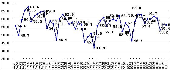 2011年1月,中國物流與采購聯合會(CFLP)發布的中國非制造業商務活動指數為56.4%,比上月回落0.1個百分點。由于非制造業沒有綜合指數,通常以商務活動狀況指數來反映非制造業經濟的總體變化。本月中國非制造業PMI各單項指數中,新訂單指數、積壓訂單指數和業務活動預期指數的環比有所回升,其余主要指數則呈現不同程度的回落。
